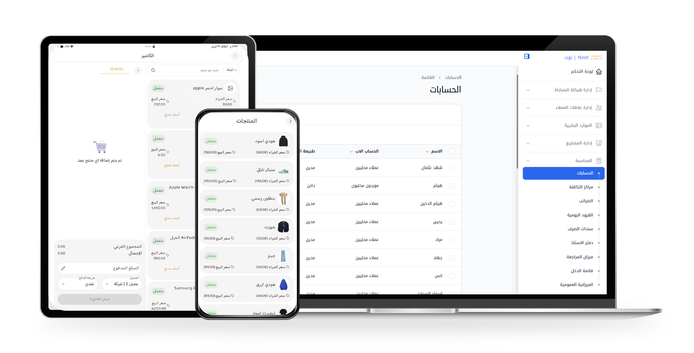 نوت يسهّل إدارة أعمالك بالكامل من المحاسبة لنقاط البيع والمخزون، مع تنظيم سلس وكفاءة عالية لكل عملياتك